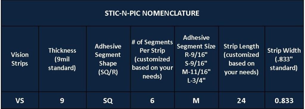 Tru-Vision’s patented Stic-N-Pic is engineered to help retailers display products with eƯiciency and confidence. Designed to securely display products with or without hanging holes, Stic-N-Pic® strips provide a clean, nearly invisible presentation that keeps the focus on the merchandise itself. Available in a range of standard strip length and adhesive spot sizes, Stic-N-Pic® strips are: